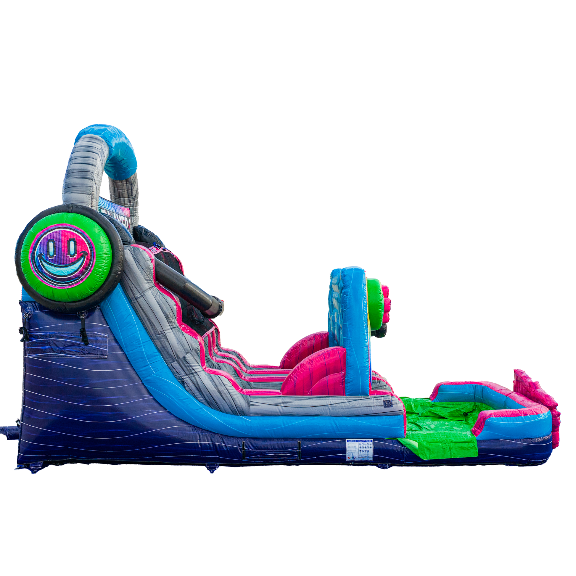 Turn heads and keep lines moving with the 16FT Glitch Dual Lane Slide. Featuring an electrifying design with bold, glitch-inspired patterns and vibrant color contrasts, this inflatable stands out in any rental listing. Its dual-lane format allows two participants to race side-by-side, doubling the fun and making it a perfect fit for school events, church festivals, and large community gatherings.