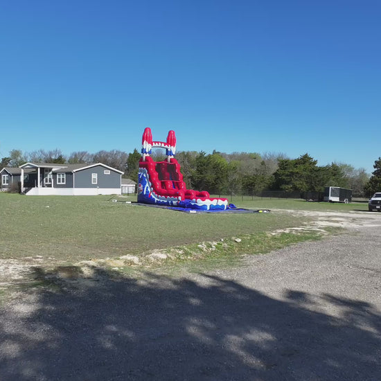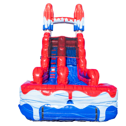 Sweet, splashy, and straight-up nostalgic—the 16FT Red, White & Cool Popsicle Slide is everything a summer rental should be. Designed to look like a giant melting treat, this vibrant inflatable water slide pops with red, white, and blue colors and dripping popsicle graphics that stop kids (and parents) in their tracks. It’s the kind of unit that makes people say, “We need that one!” before they even ask the price.