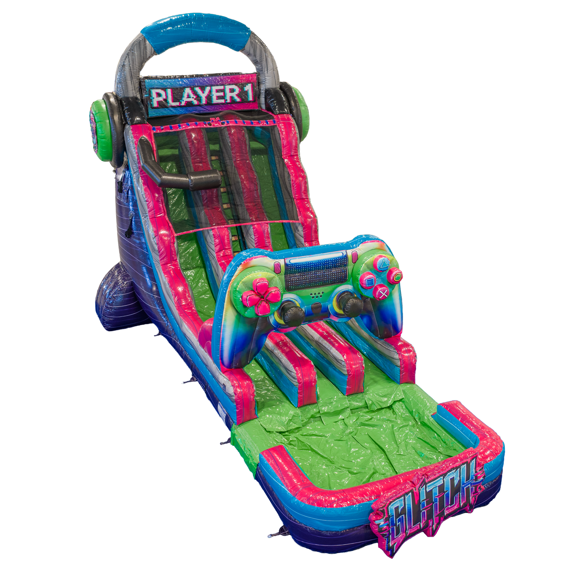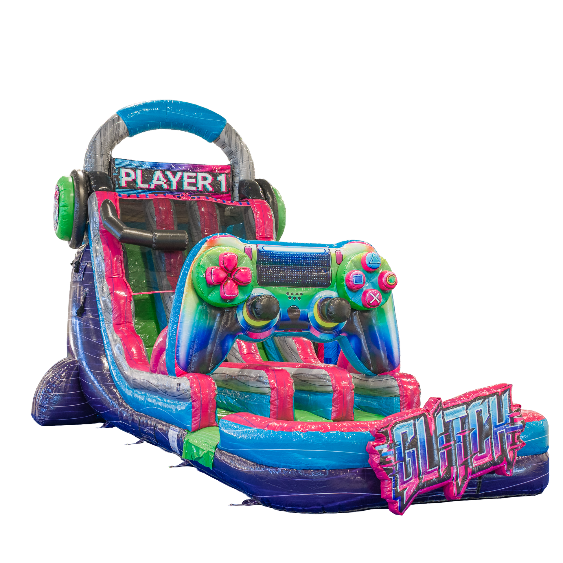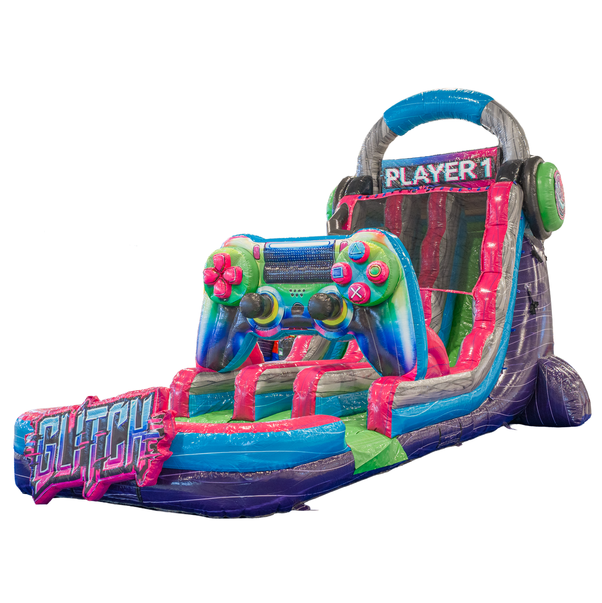 Double the lanes, double the fun! The 20FT Glitch Dual Lane Slide is a powerhouse unit packed with energy and gamer-inspired visuals. Designed with oversized remotes, TV screens, and a pixel-style palette, this inflatable makes a bold statement at every event.