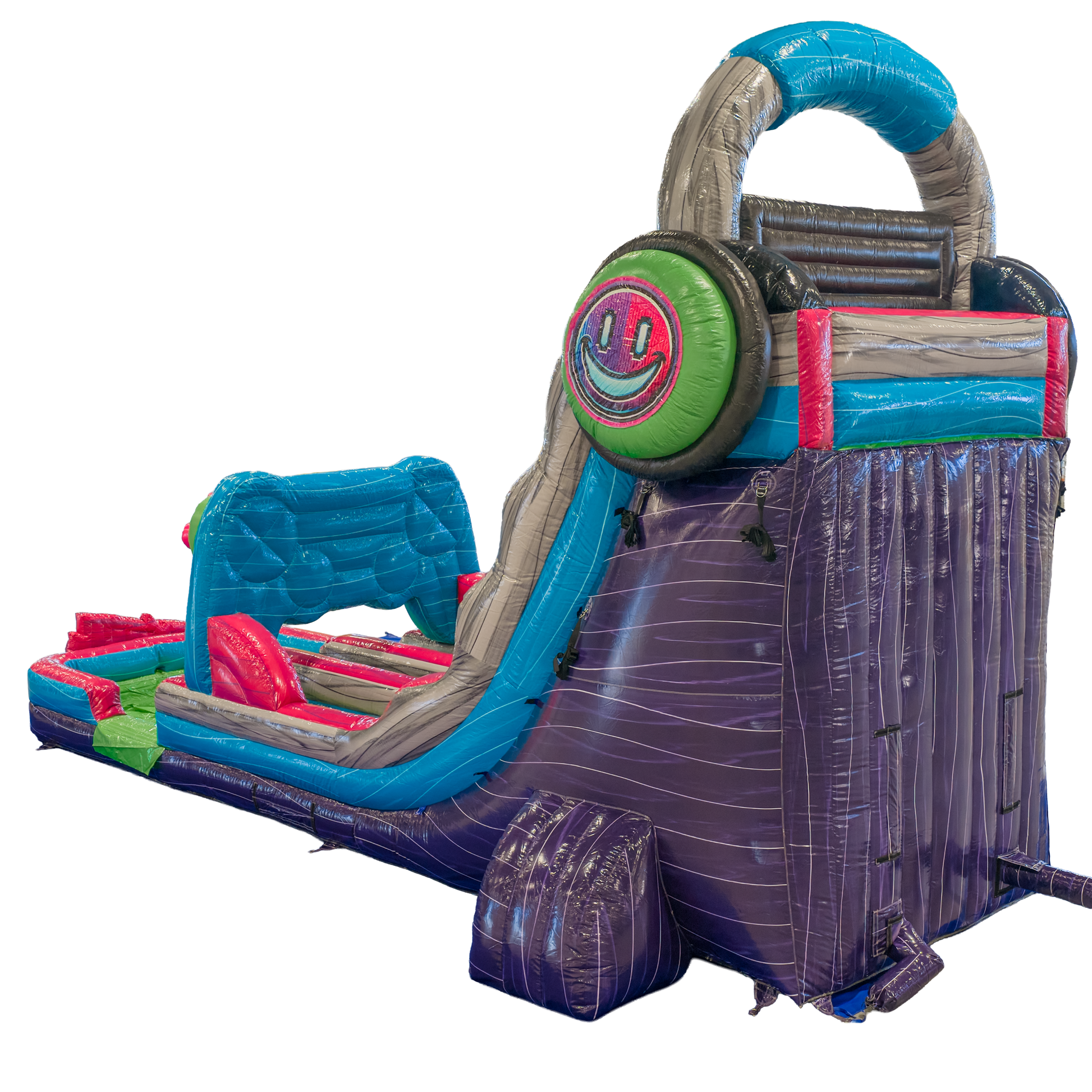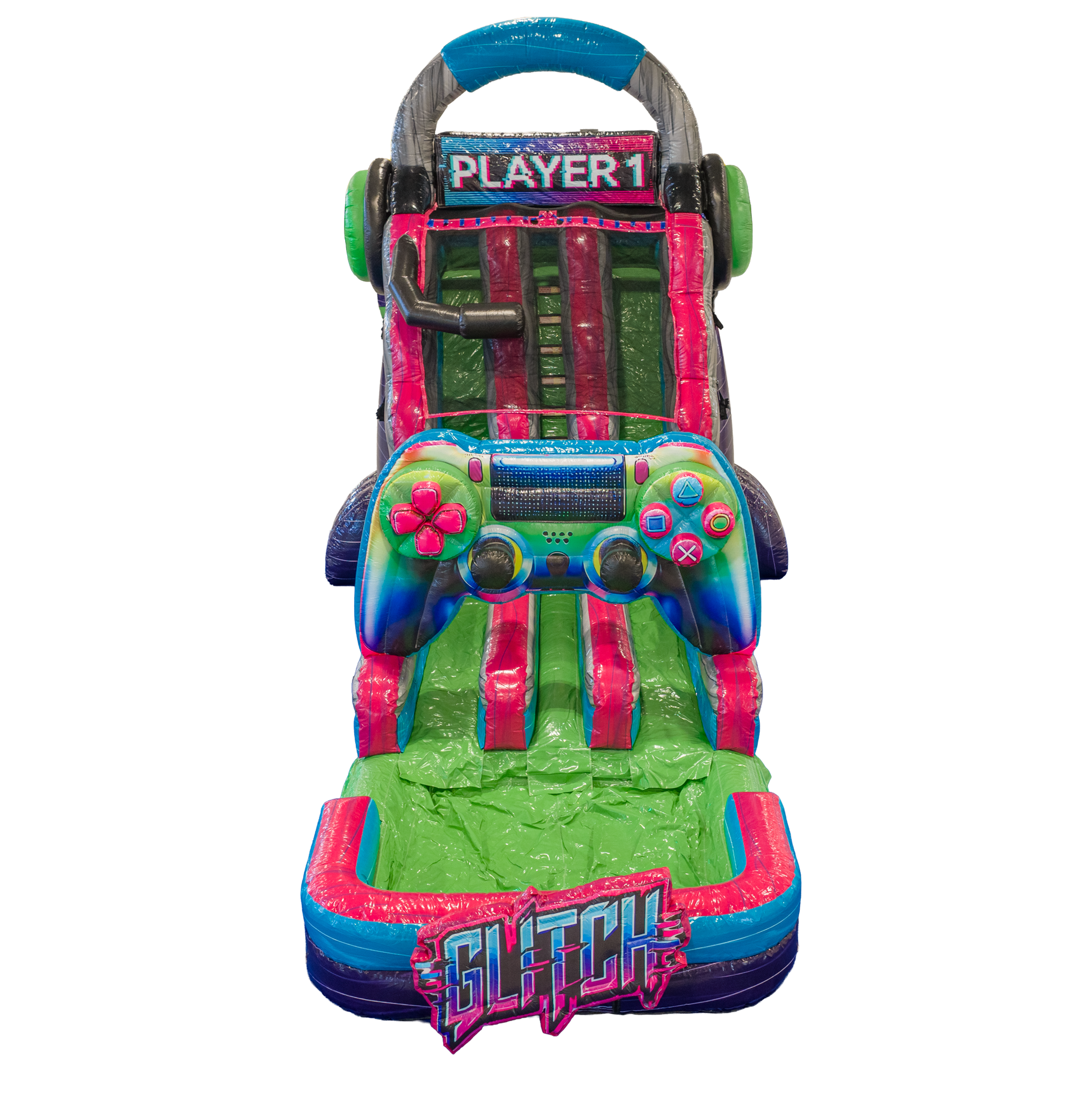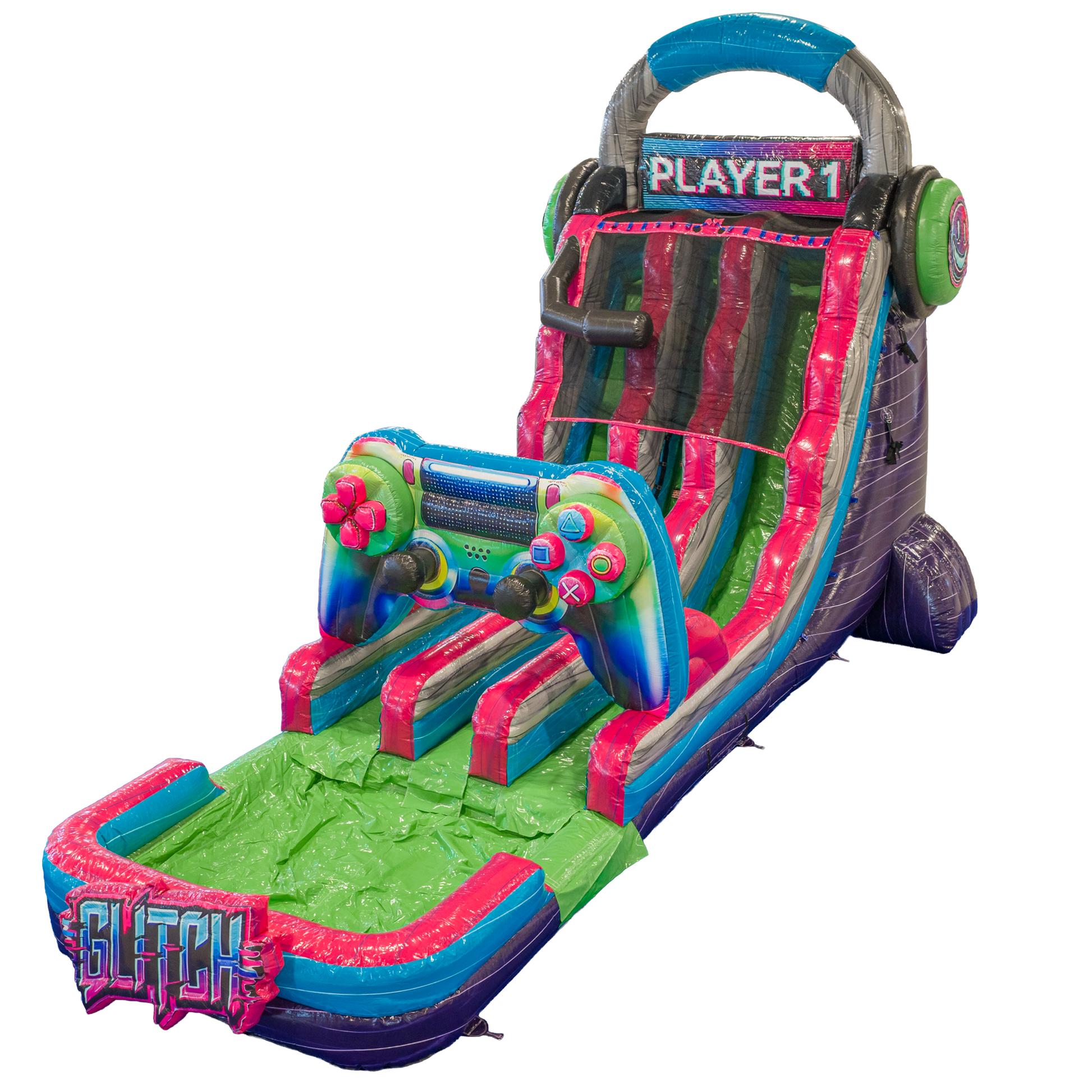 Double the lanes, double the fun! The 20FT Glitch Dual Lane Slide is a powerhouse unit packed with energy and gamer-inspired visuals. Designed with oversized remotes, TV screens, and a pixel-style palette, this inflatable makes a bold statement at every event.