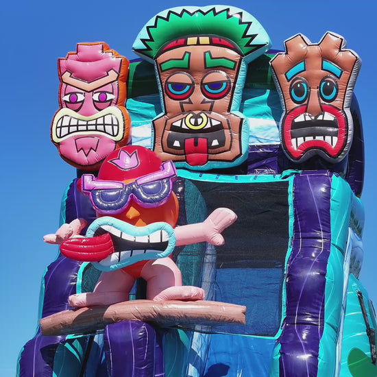 Bring a tropical twist to your rental lineup with the 22' Tiki Tovi Single Lane Slide! Towering at 22 feet tall, this eye-catching inflatable features bold island colors, playful palm trees, and a cheerful Tiki face that instantly grabs attention at any event.
