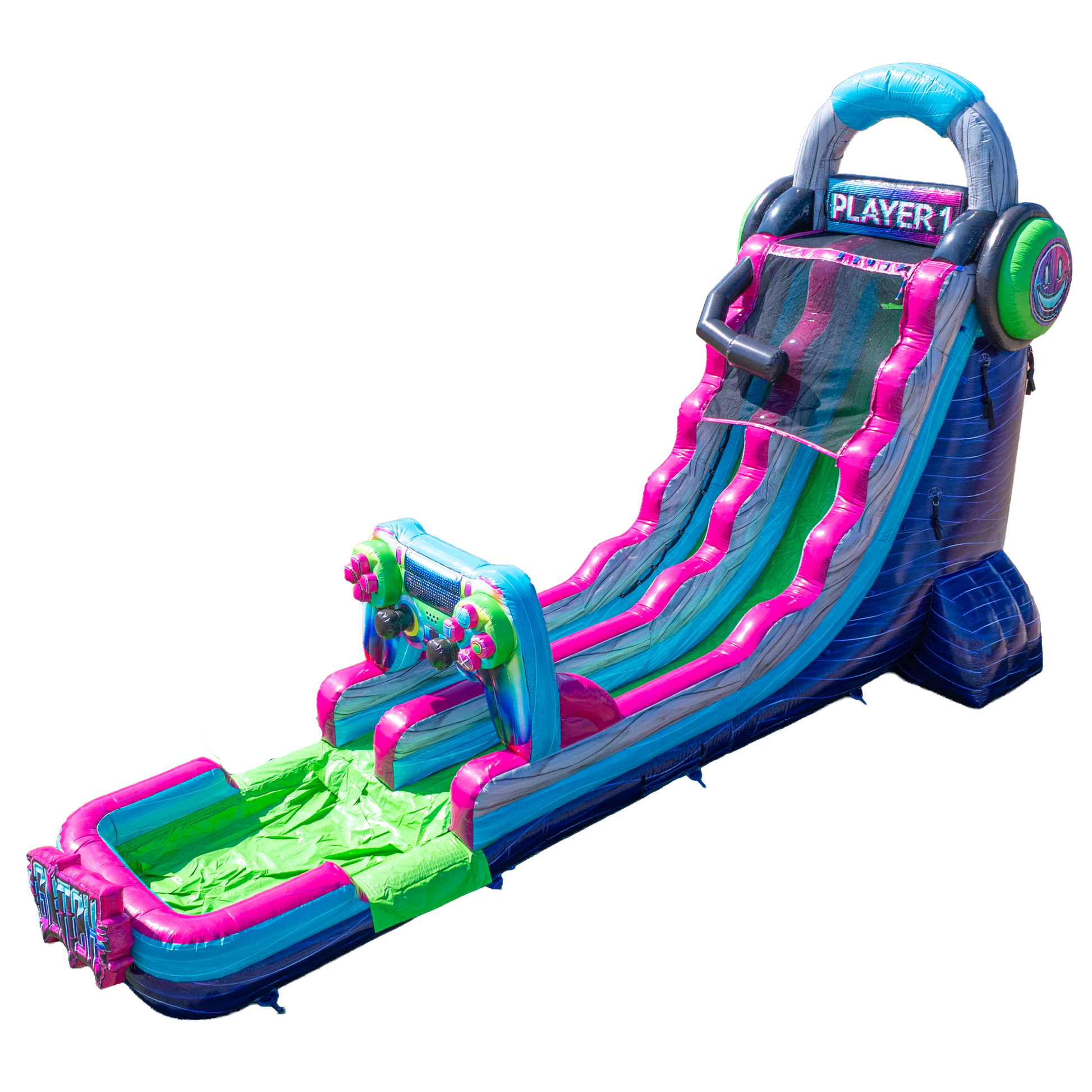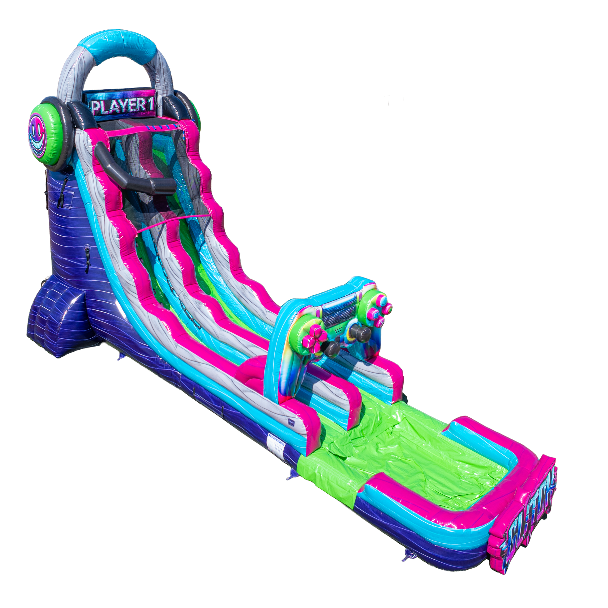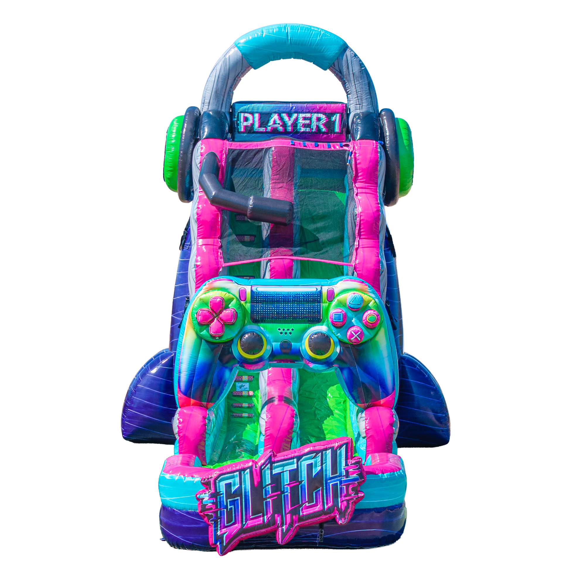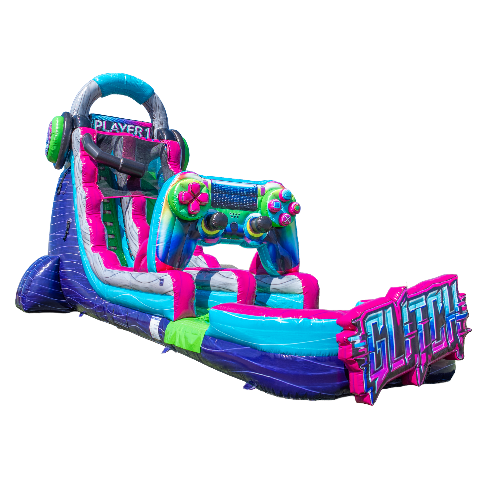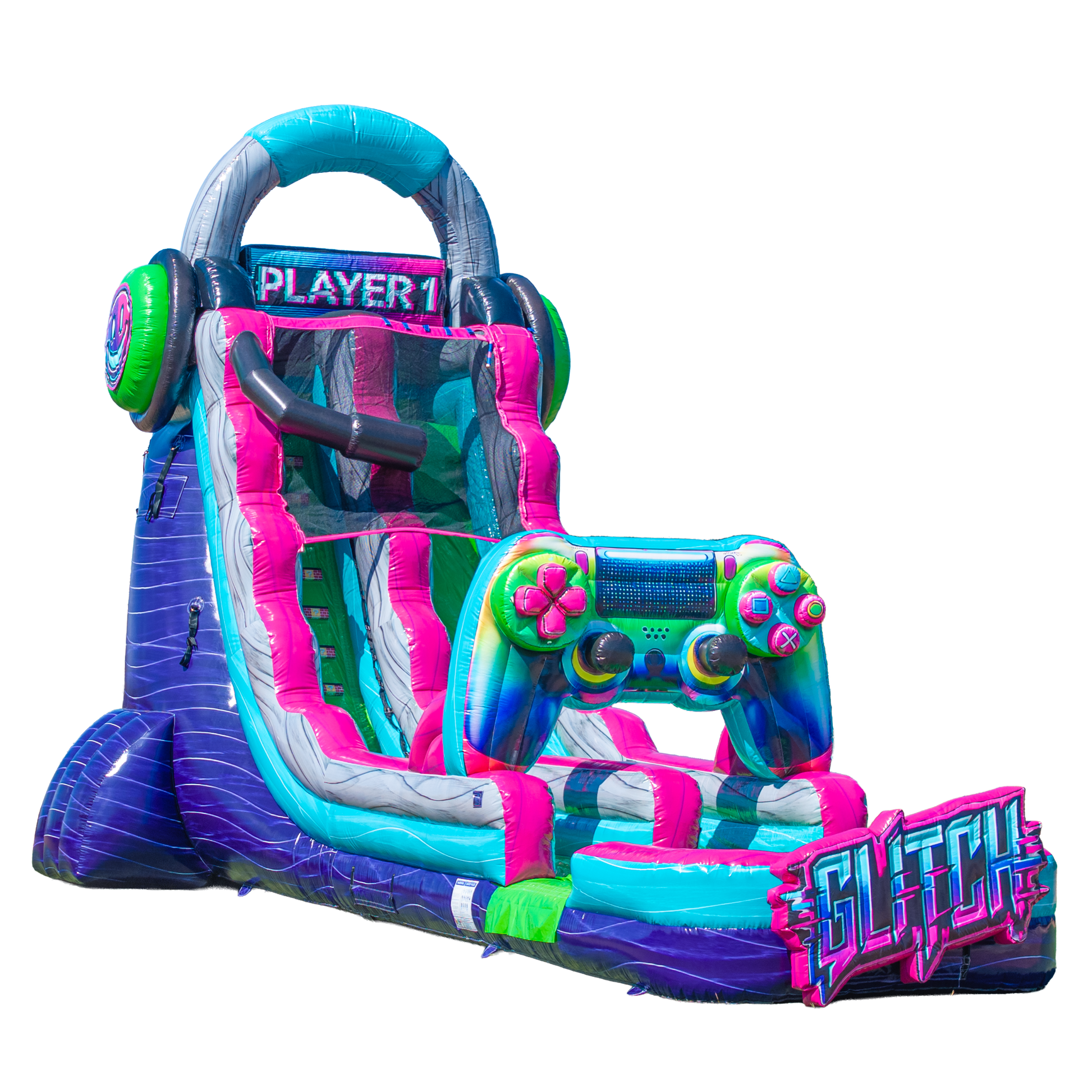 It’s game on with the 22FT Glitch Single Lane Slide—where retro-gaming vibes meet real-world adrenaline! This towering inflatable water slide is a crowd magnet, packed with joystick graphics, pixel art, and bold gamer styling that screams fun from across the lot. Designed for ages 7 through adult, it’s the ultimate way to keep older kids and thrill-seeking teens engaged.