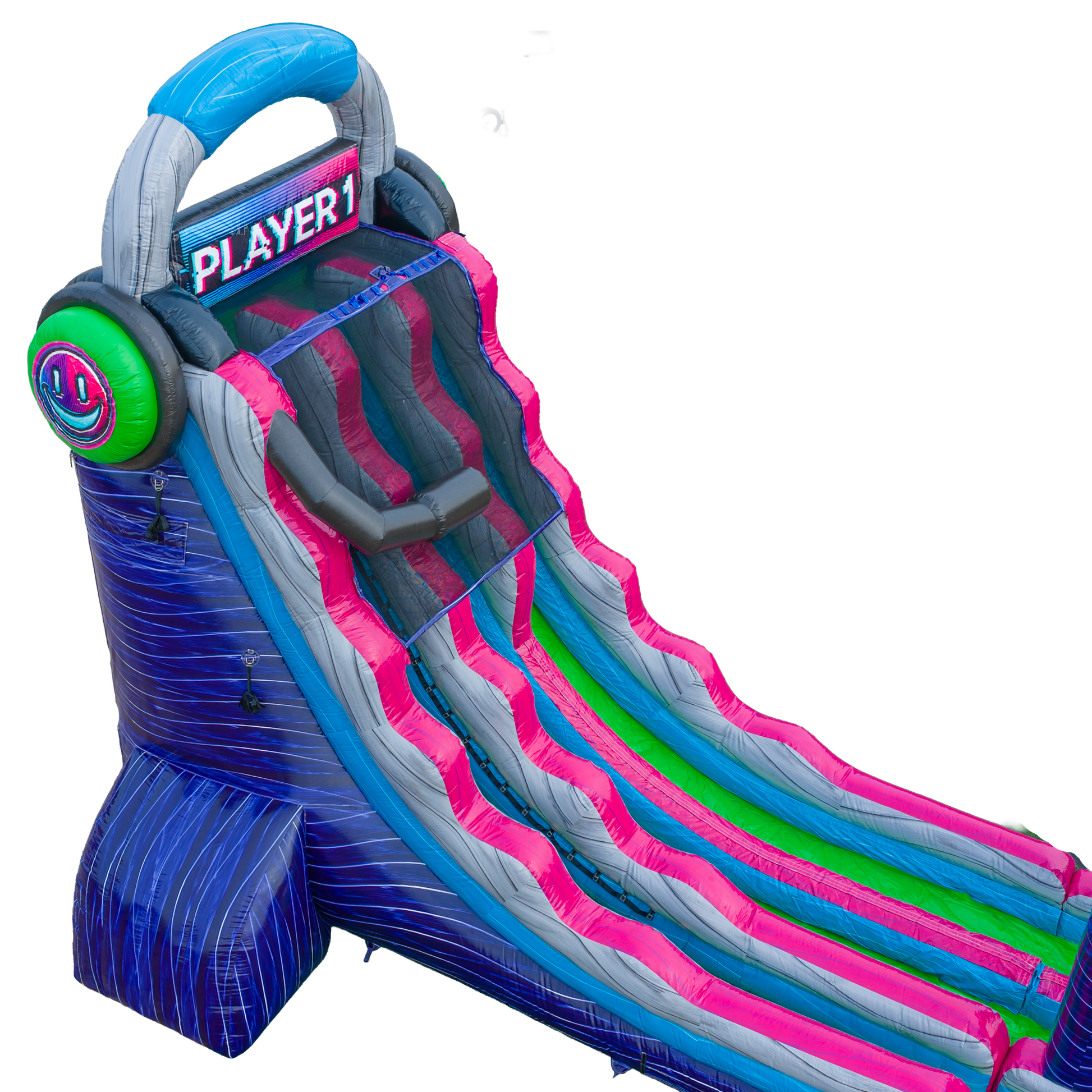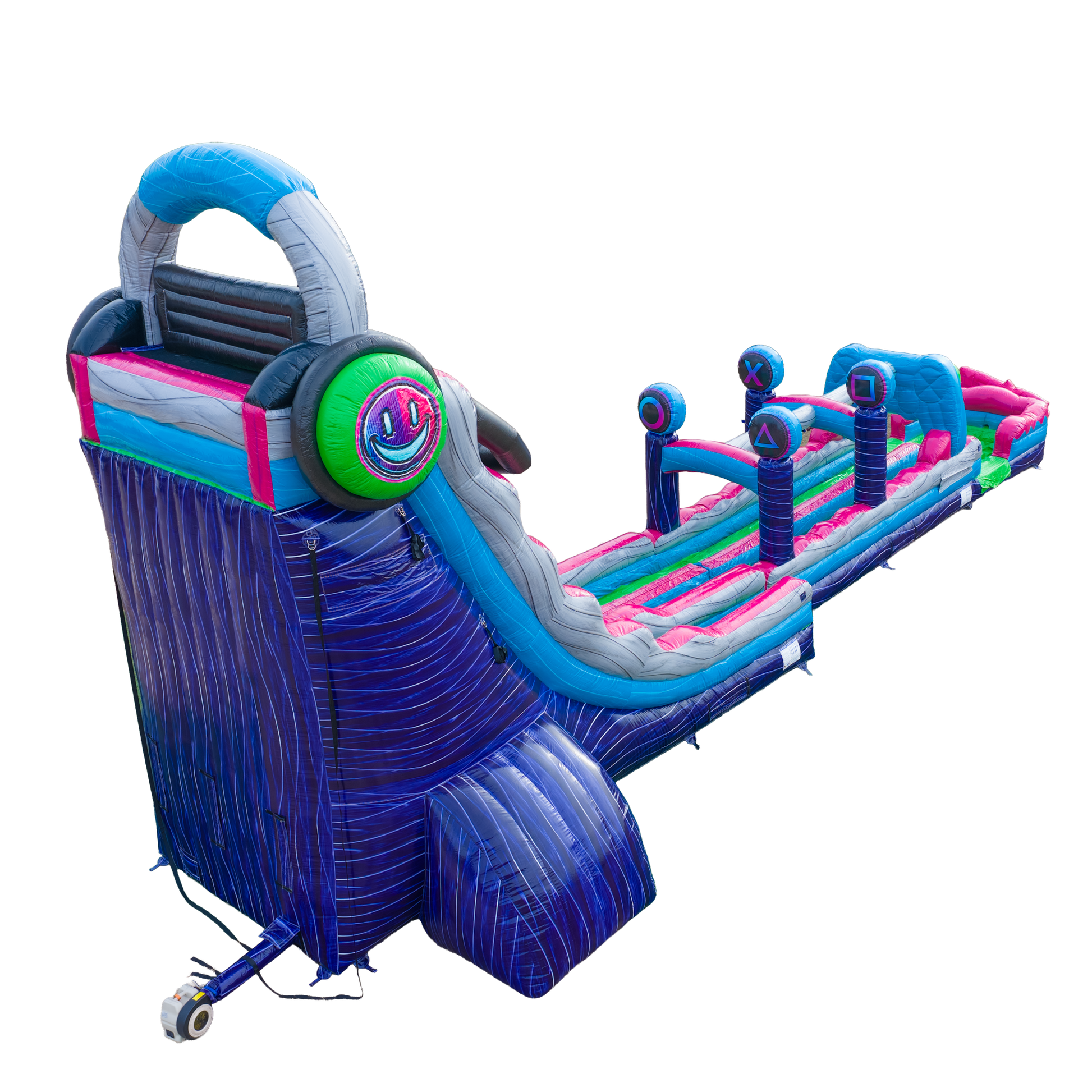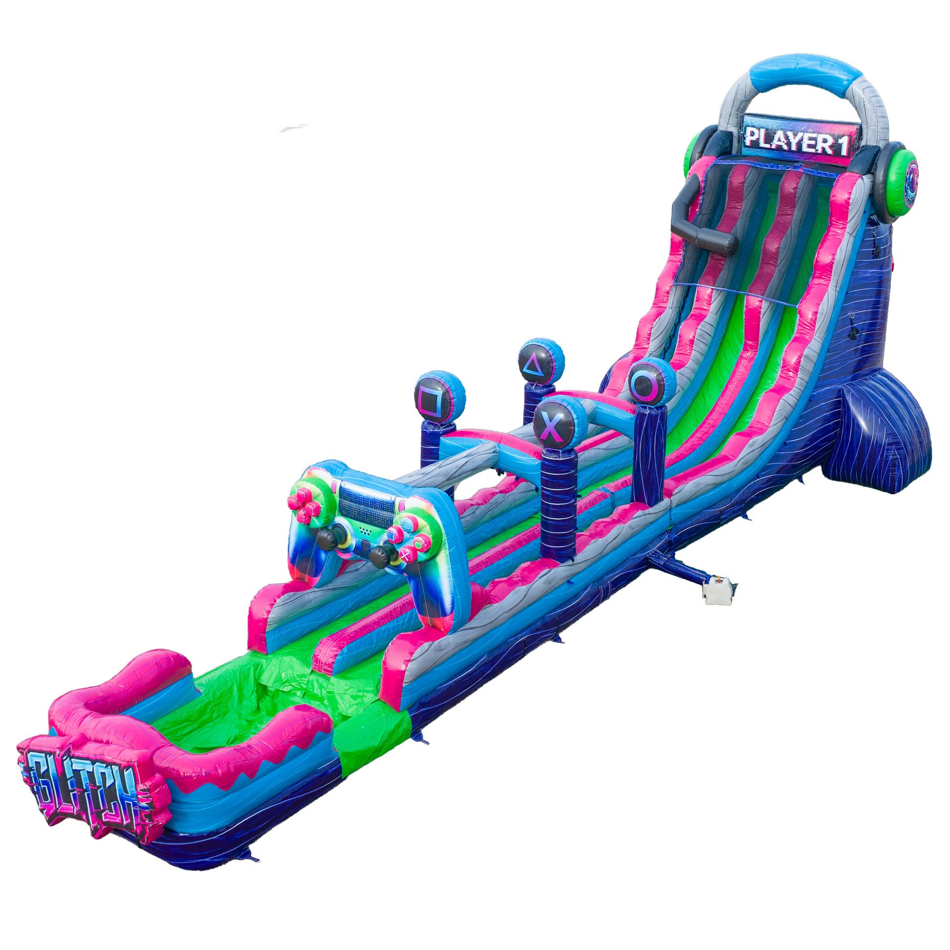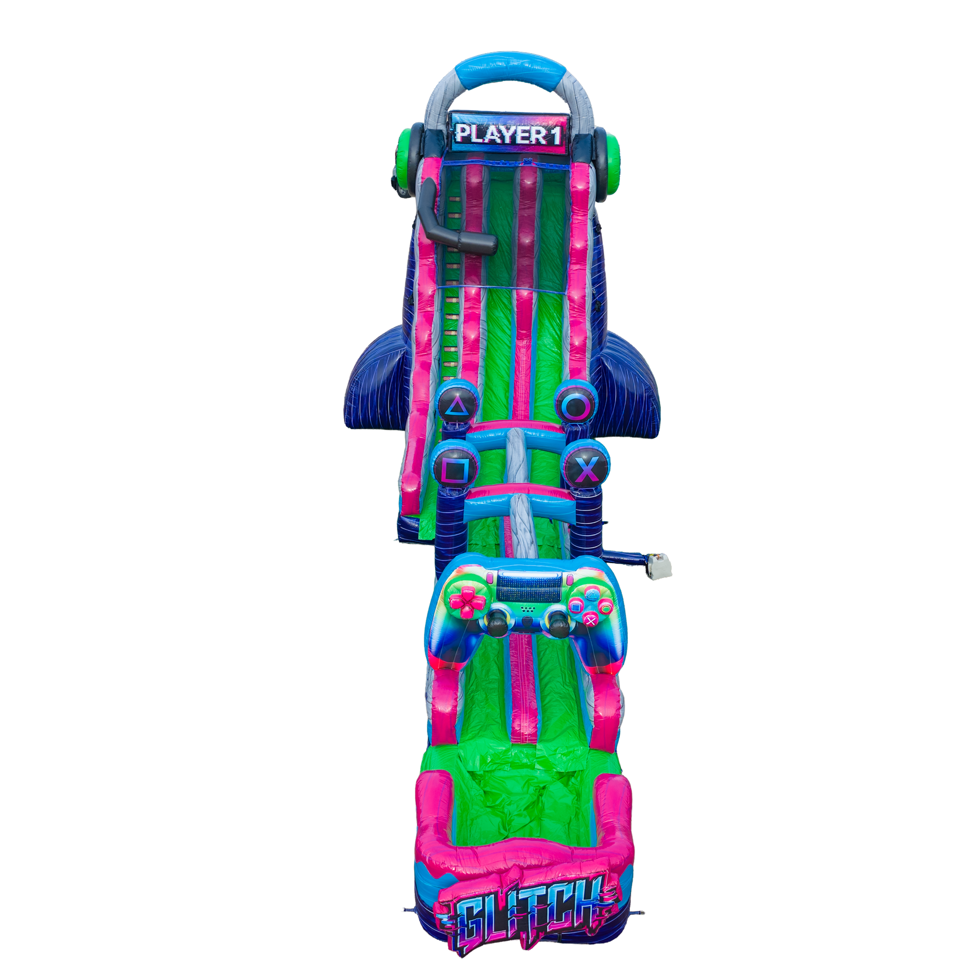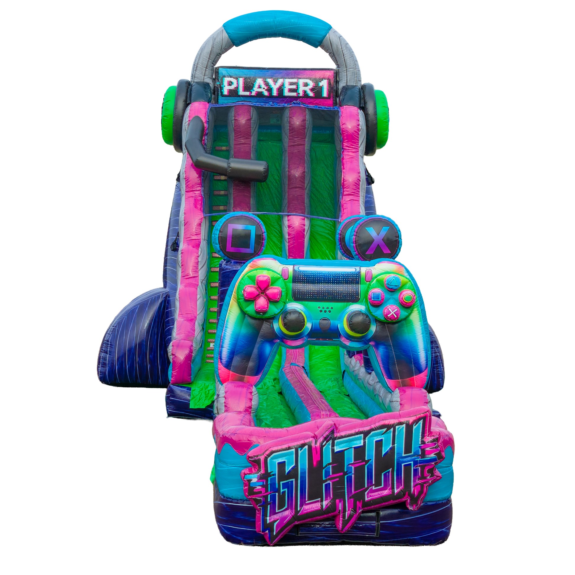Now this is how you level up. The 27FT Glitch Dual Lane Slide with Slip n Slide is an absolute beast—towering, bold, and built for maximum fun. With two racing lanes, a huge extended slip-n-slide runway, and gamer graphics that pop from a mile away, this unit is pure rental power.
