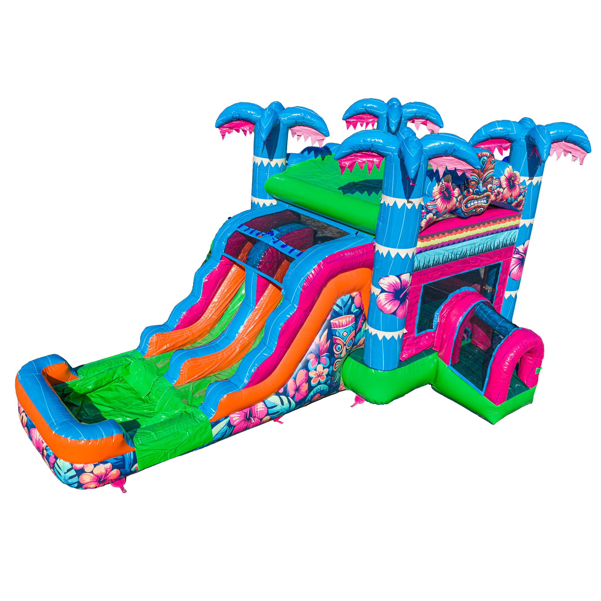 Designed with vibrant printed vinyl and bold hibiscus artwork, the Aloha Splash Hibiscus Combo brings an instant island vibe to any event. With its lively color palette and tropical styling, this unit stands out at backyard parties, school events, and community gatherings. Kids ages 2–12 love the playful layout, while rental operators appreciate how quickly this piece draws attention and converts views into bookings.