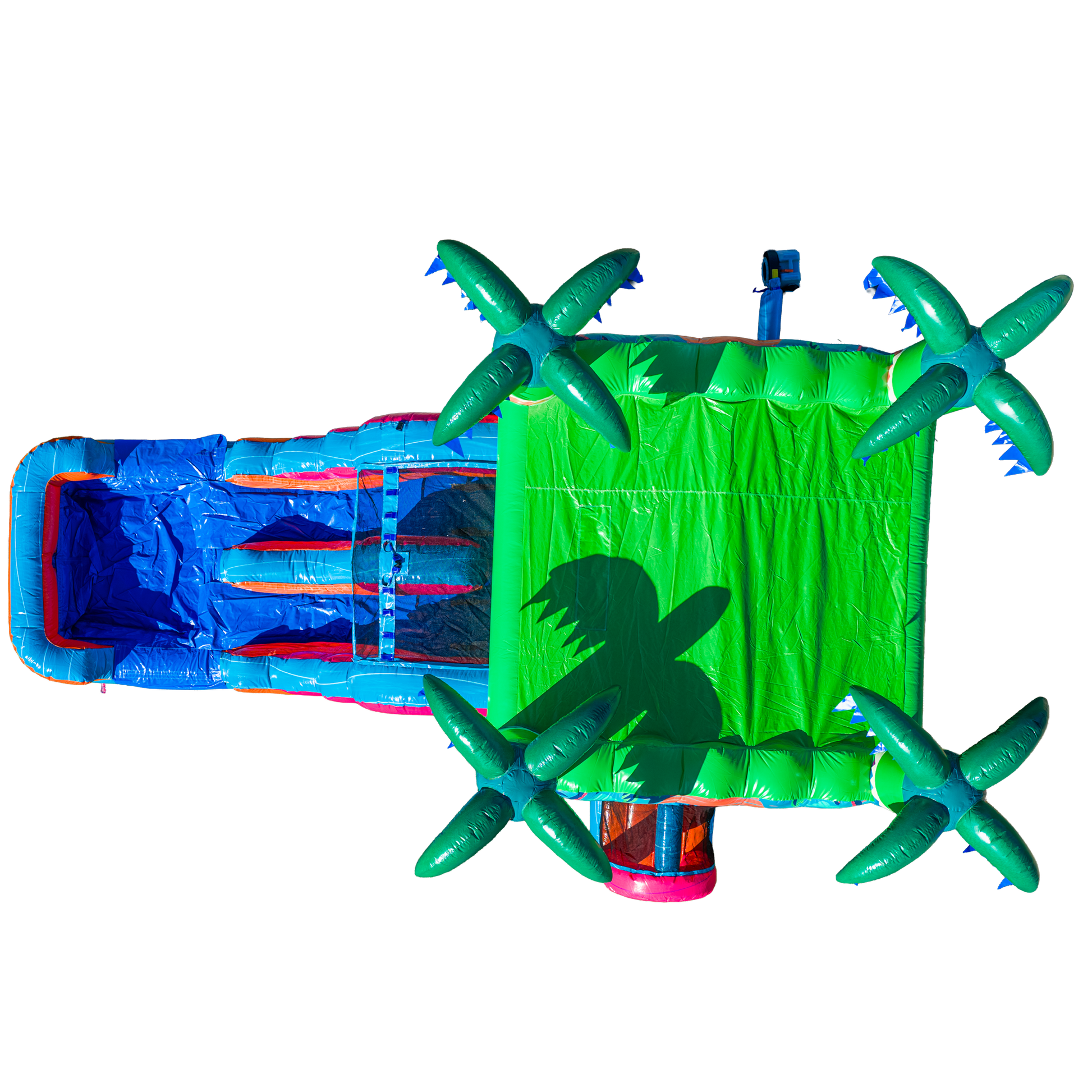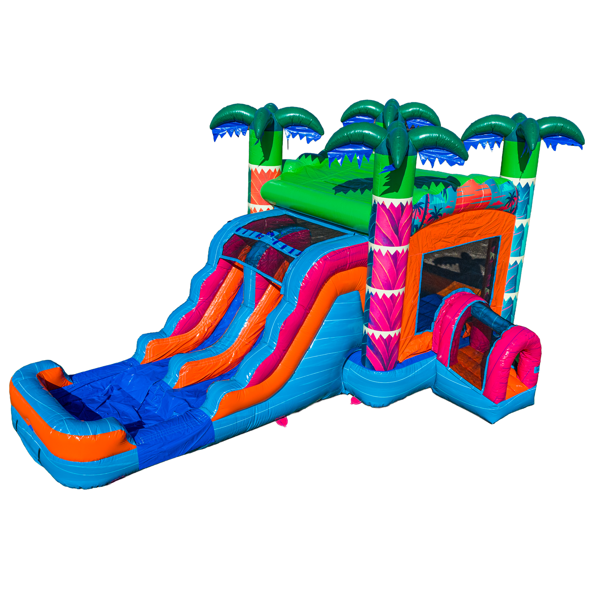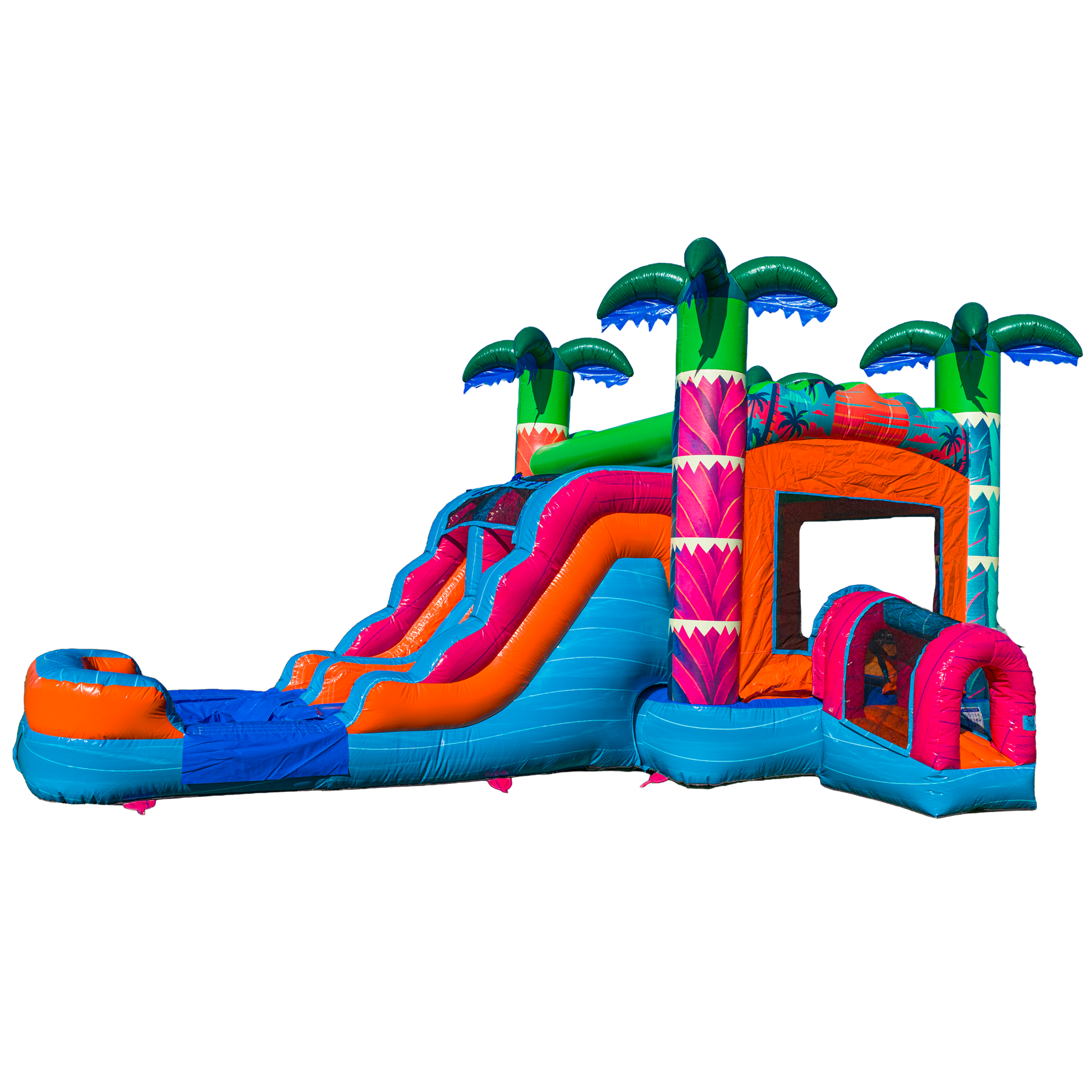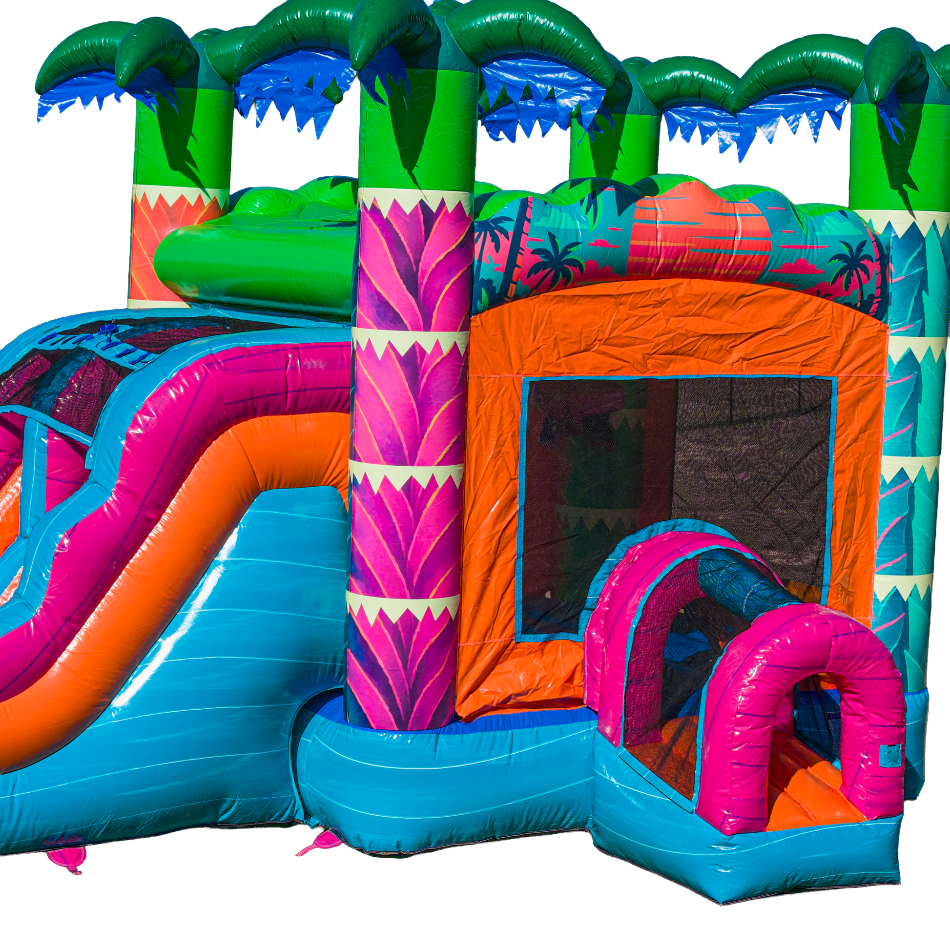 Built for ages 2 to 12, the combo unit features a spacious bouncing area, climbing wall, and slide—making it a triple-threat for nonstop activity. Constructed from commercial-grade materials, this unit is engineered for durability and easy setup, saving you time while delivering unforgettable fun. If you're looking for an inflatable that turns heads and books itself, the Electric Tropics Combo is it.