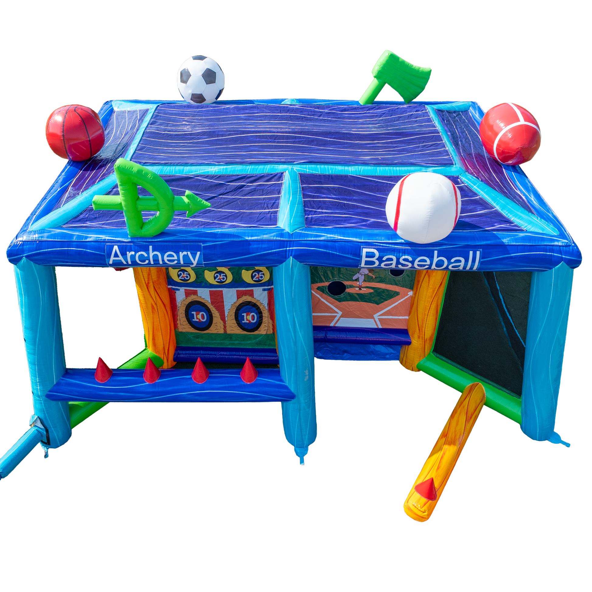 Get In The Game with the Fieldhouse 6 from Big and Bright Inflatables! Featuring 6 games in one including Archery, Baseball, Football, Axe Throwing, Soccer, and Basketball!