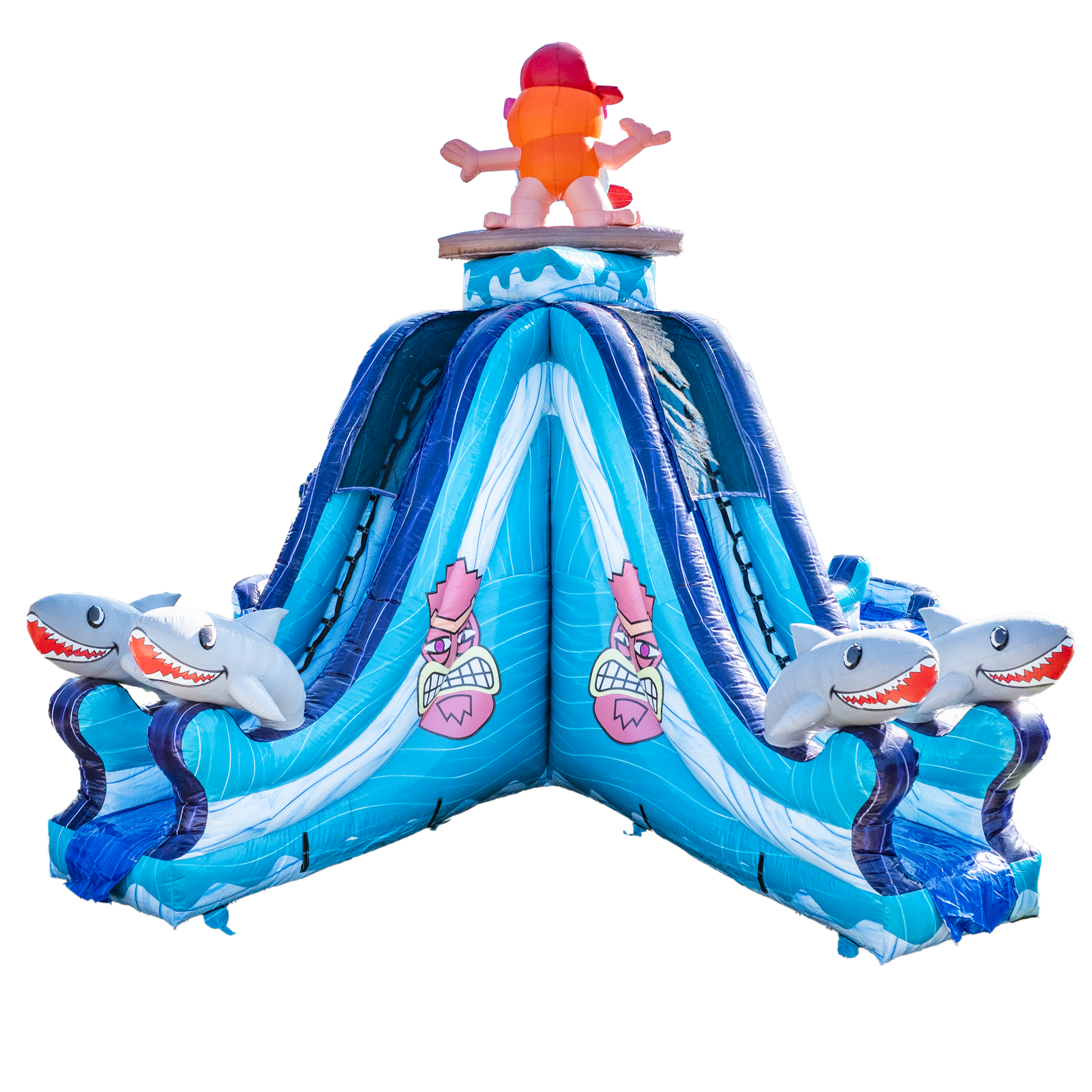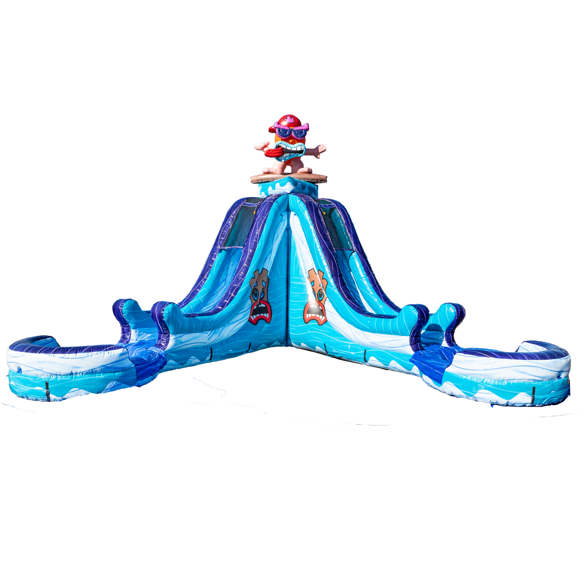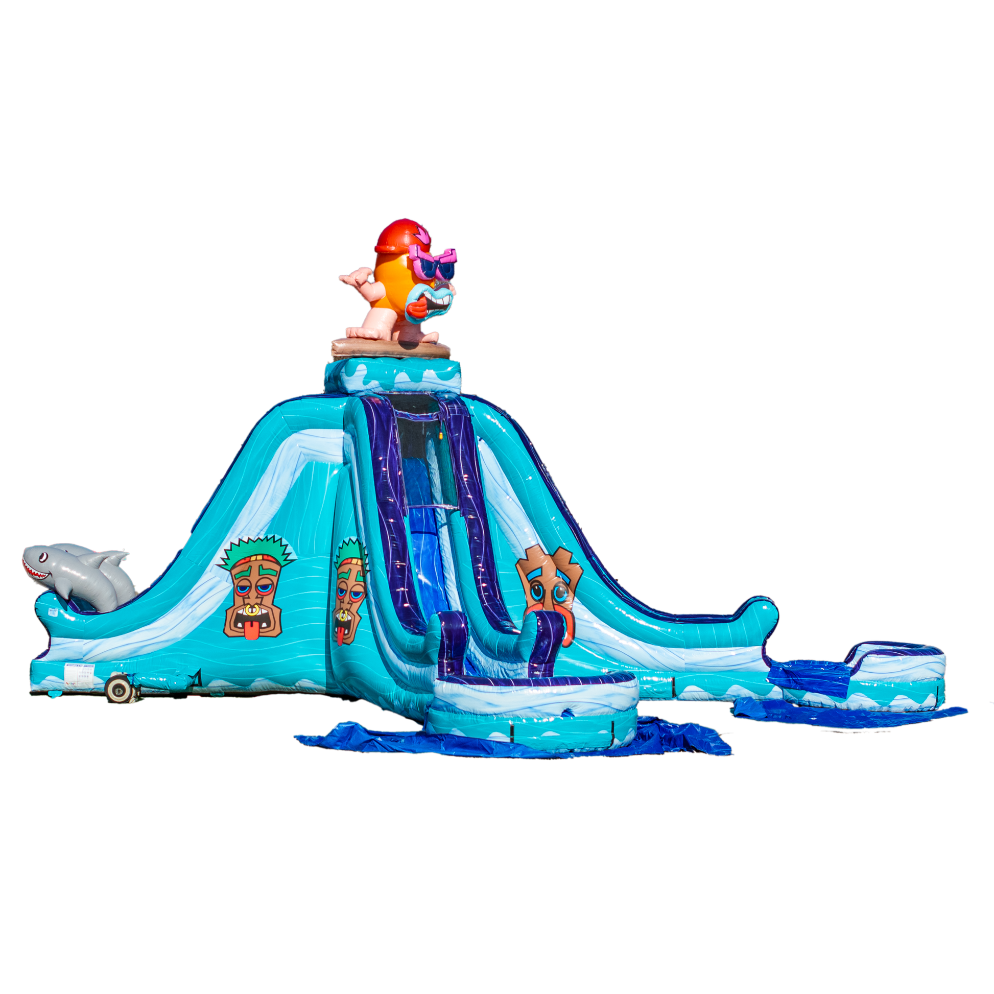 Say hello to your next rental showstopper—the Tiki Tovi X-Treme. Standing 22 feet tall with twin sliding lanes, this tropical-themed inflatable water slide is built to dominate summer rentals. It’s the latest powerhouse in the Tiki Tovi Collection and perfect for ages 7 to adults who crave fast, cool fun.